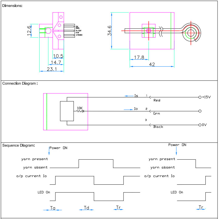 Optical Yarn Detectors are suitable to wide range of natural or synthetic yarns. It detects break all standard yarns with balooning, and traversing paths. The sensor remains on one side of the yarn to ease threading. Not recommended for sensing coloured yarns.